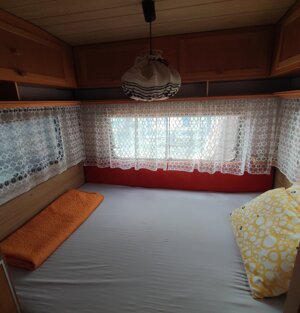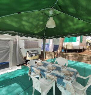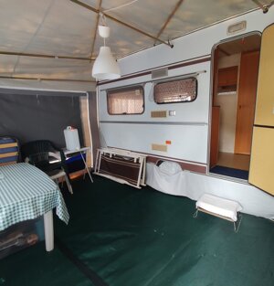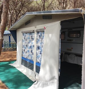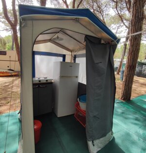 Ecco la nostra roulotte 3 posti letto, composta da veranda, gazebo e cucinotto con stoviglie.