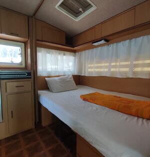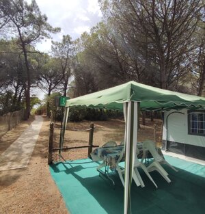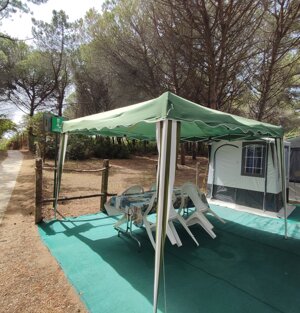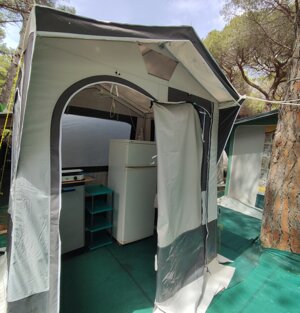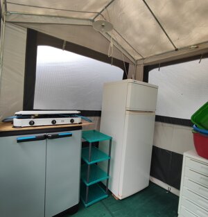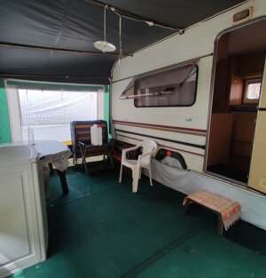 Ecco la nostra roulotte 5 posti letto, composta da veranda, gazebo e cucinotto con stoviglie.